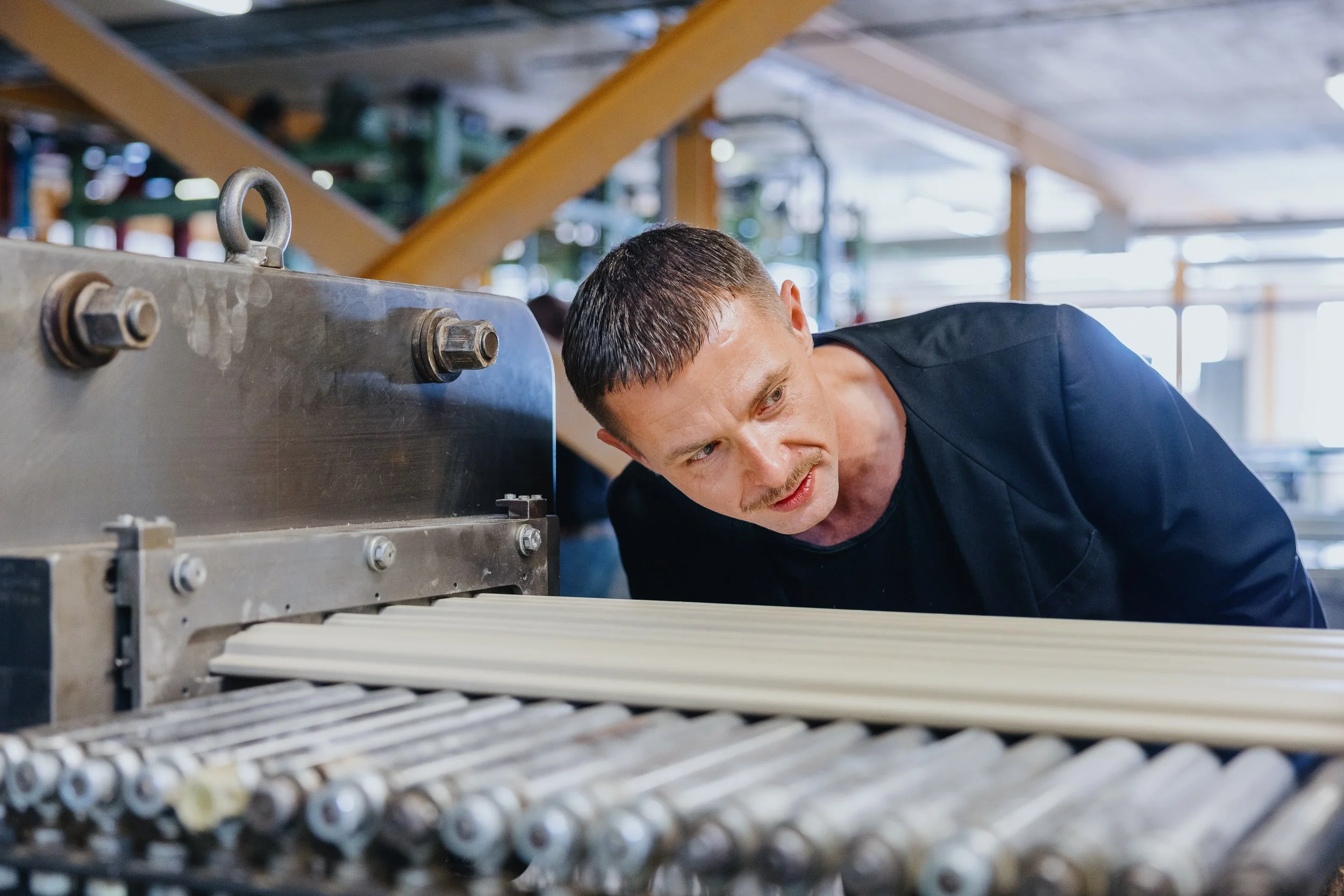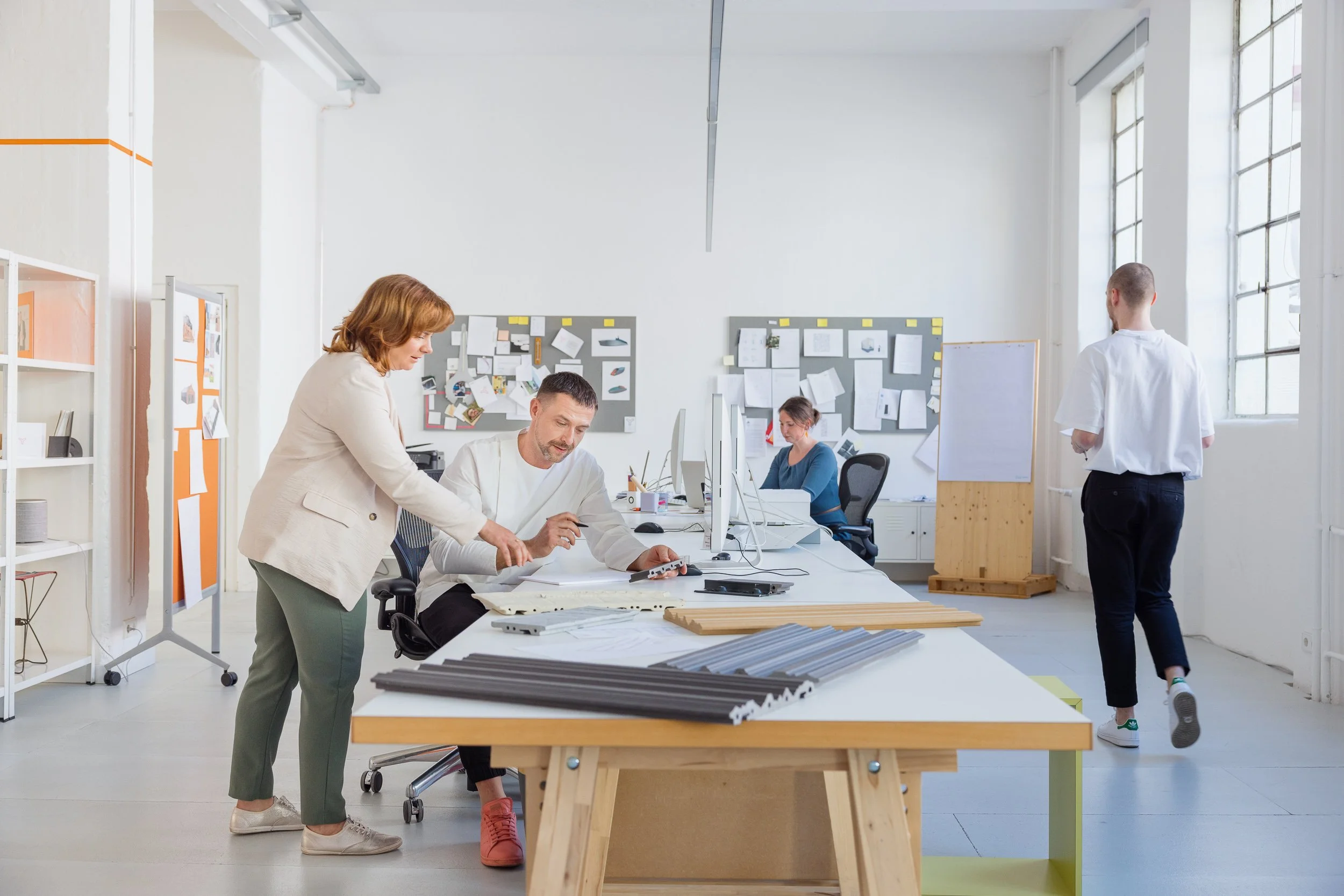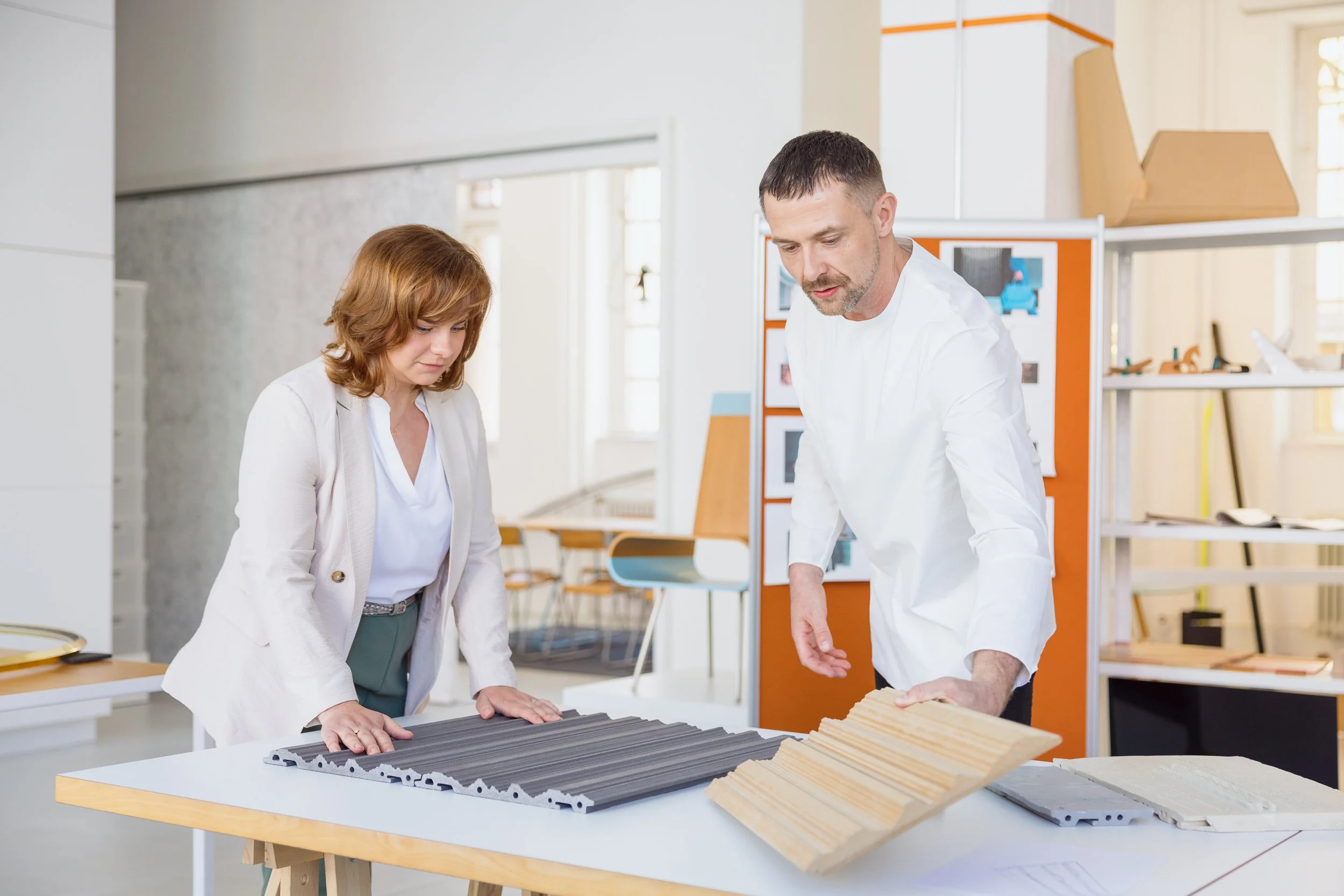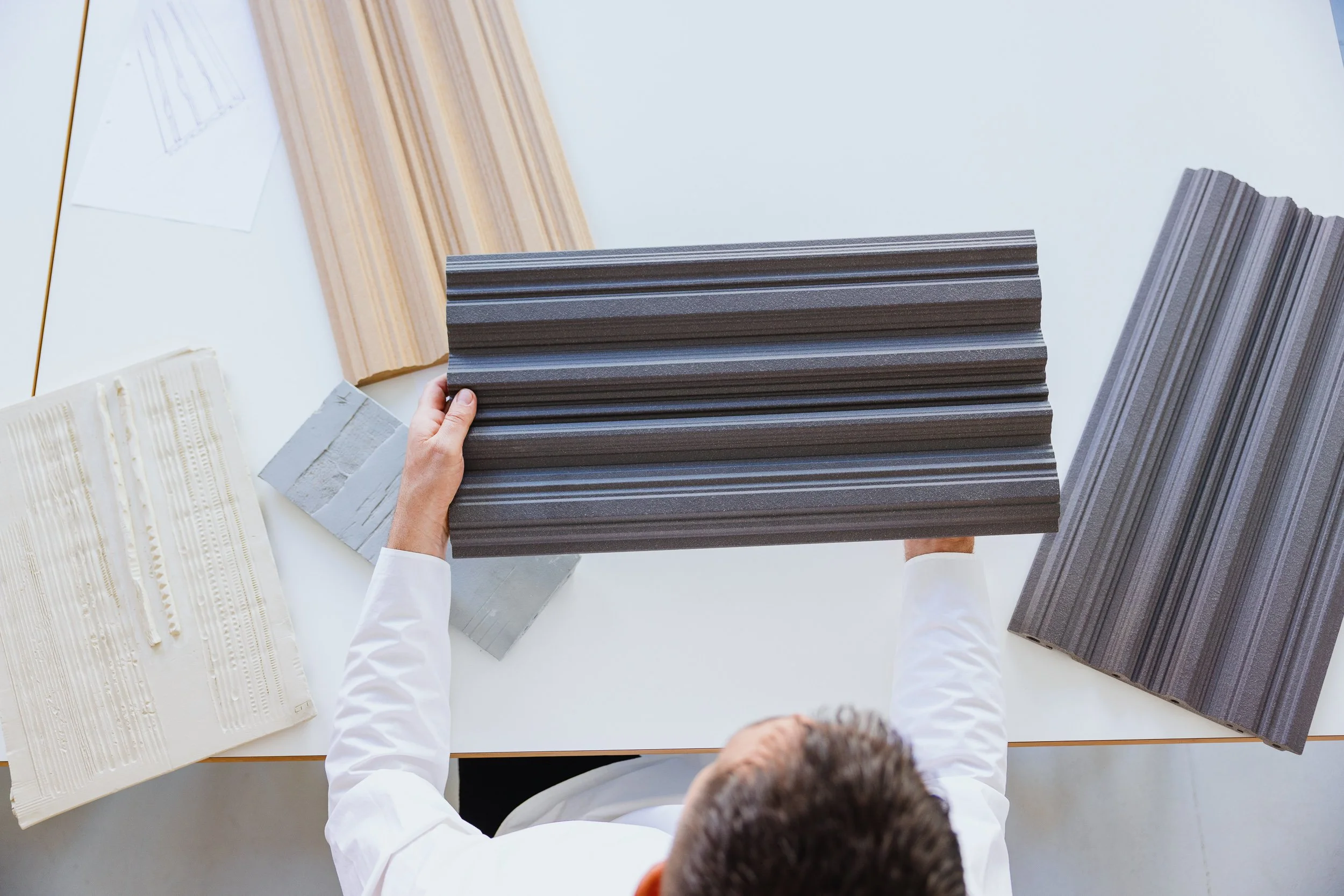 Szenische Fotodokumentation mit Markus Bischof in seinem Atelier sowie im Werk von Agrob Buchtal im Zusammenhang mit der Entwicklung keramischer Fassadenprodukte. Die fotografische Leistung umfasste Arbeits- und Besprechungssituationen, Portraits, technische Produktdetails und materialbezogene Oberflächen sowie die Dokumentation einer internen Produktpräsentation im Projektkontext. Im Mittelpunkt standen die visuelle Verbindung von Person, Entwurfsprozess, technischer Innovation und atmosphärischer Situation in einem architekturnahen Umfeld.